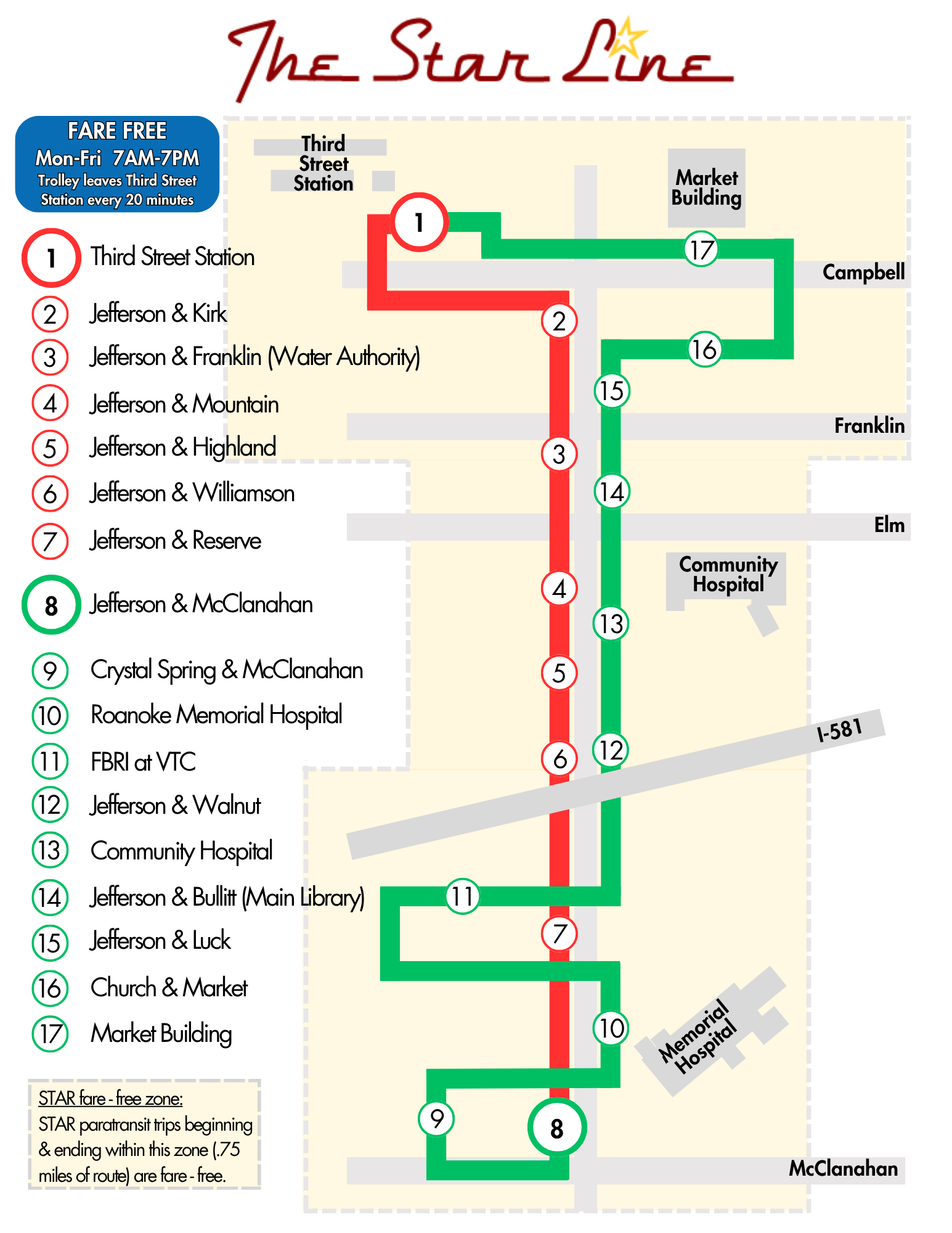 The Star Line Trolley is Valley Metro's newest transportation service. The Star Line provides free, convenient transportation to retail businesses, schools, libraries, restaurants, and lodging along Jefferson Street between Downtown Roanoke and Carilion Roanoke Memorial Hospital.